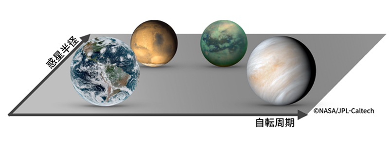私たちが研究するのは実在する惑星だけではありません。惑星大気の運動は、どれも自転する球面上の流体力学でおおよそ説明できるはずです。言い換えると、惑星大気の振る舞いの違いは、惑星半径や自転周期や重力などのパラメータの違いによるものと考えられます。私たちは、大気運動の惑星パラメータに対する依存性を網羅的に調べることで、多様な惑星大気運動の本質をとらえ、理解することを目指しています(図3)。